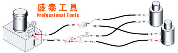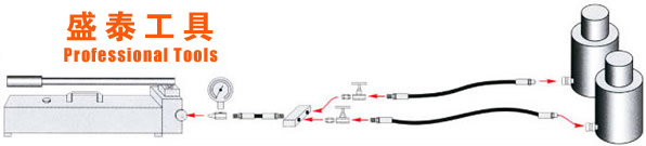 | 单作用手泵+分配器+2跟软管+2个单作用千斤顶 .使用1台具有两个或更多接口的分配器,可同时驱动两台以上的单作用千斤顶。 .每个接口可以安装节流阀 .可单独调节流入每个千斤顶的流量,使每个千斤顶的顶升高度不通,保持顶升工件的平行移动。 .每个产品可单独配置压力表和表座。 |