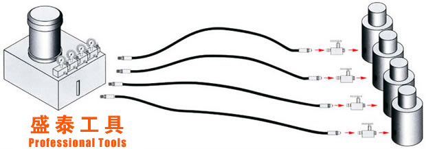 | 单作用电动泵+分配器+5根软管+4台单作用千斤顶 .使用1套4台或更多接口的分配器,同时顶升4台或4台以上的千斤顶,每台千斤顶单独配置节流阀及手控单向阀,提供流量调节,可实现基本的同步功能。 |